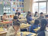 南原小では、今年の6月から、感染症予防に配慮しながら、机と机の間に距離をとって、お互いに向き合って食べる給食を実施しています。