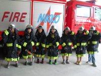 防火服を着て、放水体験!楽しかったけれど、重くて大変でした・・・