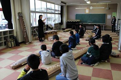 琴体験では,二人~三人で一組となり琴の練習をして