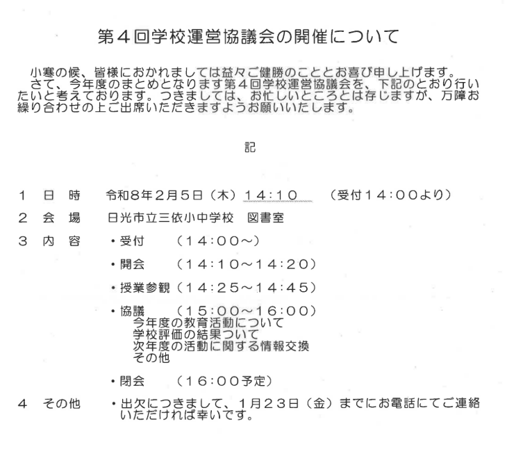 来月2月5日(水)に第3回学校運営協議会を開催いたします。