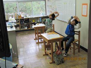 朝の会で目と姿勢の健康ノートが配られ、担任の先生から説明があり、今週の目標を書き込みました。そして、昨年作成した、三依小中児童生徒職員出演による動画を見ながら姿勢体操を行いました。今週は、姿勢体操のほかに、授業開始の礼や授業中・給食中の姿勢などに気をつけたり、親子運動教室で姿勢保持に必要な筋肉体力作りをしたり、視力検査をしたりします。