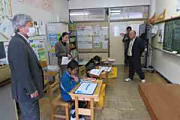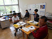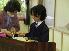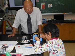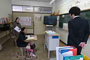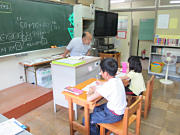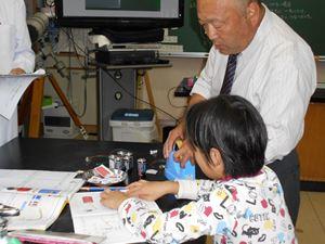 写真は授業の様子です。小学3年生は1名ですが、担任の先生と一緒に明かりの点く回路と点かない回路を調べました。