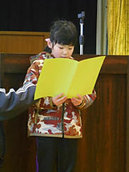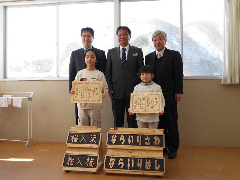 2月22日(木)ランチルームにてナラ入沢にかかる橋のプレート授与式が行われました。本校の児童2名が書いた文字が実際にプレートになり、児童は感謝状と記念品を受け取りました。とても立派なプレートに児童も先生達も驚きました。実際に自分たちが書いたプレートが橋に取り付けられるのは大変光栄なことですね。このような貴重な体験をさせていただいた日光土木様、斉藤建設様には心より感謝申し上げます。本当にありがとうございました。