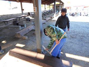 ・足で薪を割ります ・新聞紙を丸めてマッチで火を点けます