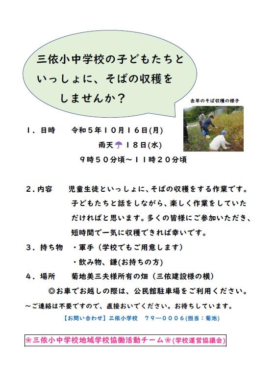 先日、回覧板でお知らせをさせていただきましが、ぜひぜひ、三依小の子どもたちと一緒に、