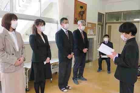 児童生徒代表のお別れのことばと花束贈呈のあと、離任する先生方からご挨拶をいただきました。新任地でのご活躍をお祈り申し上げます。
