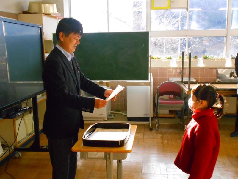 卒業証書が手渡され、校長からは、2名の卒業生それぞれとの思い出と学校への貢献を振り返り、4月から始まる新生活へのはなむけの言葉が贈られました。小学校在校生による「送る言葉」と卒業生による「お別れの言葉」、中学校在校生による「送辞」と卒業生による「答辞」が述べられ、式歌「旅立ちの日に」、「三依小学校校歌」、「三依中学校校歌」が響く中、和やかで厳かな雰囲気のうちに式が進行しました。