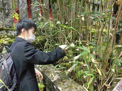ビジターセンターでお昼を食べたら、温泉寺と泉源に向かいます。わき出る温泉の温度を体感したり50円玉で実験をしたりと、体験を通した学びがありました。帰り道では竜頭の滝に立ち寄り、まさに見頃を迎えたトウゴクミツバツツジを堪能しました。