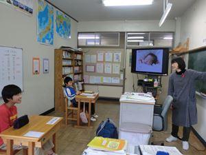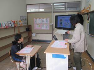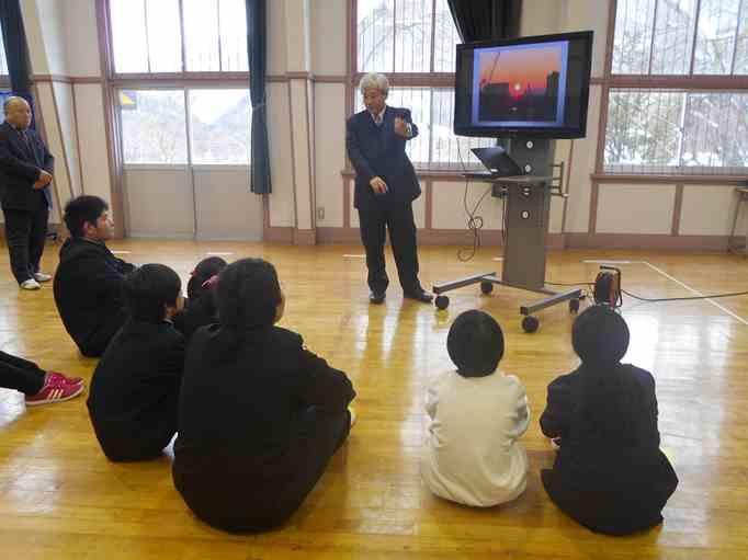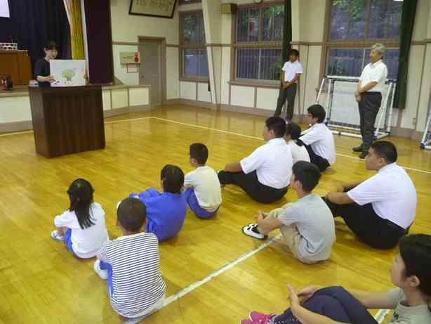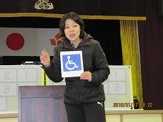薄井先生お一人の発表で、絵を見せながらクイズを出してお話が始まりました。児童生徒に見せながらユニバーサルデザインの意味と障害のある方に対する配慮や望ましい行動について、わかり易く説明されていました。優しい心の溢れる三依の子どもたちは、真剣な表情で頷きながら聞いていました。