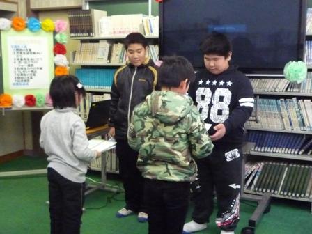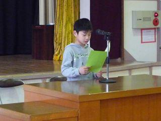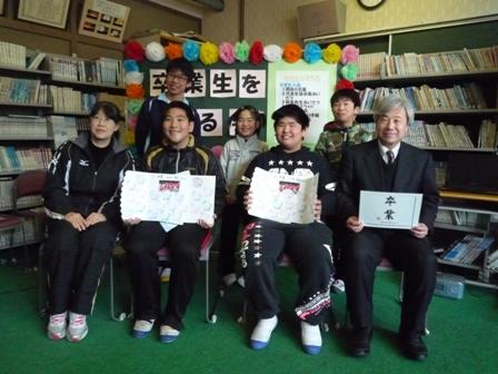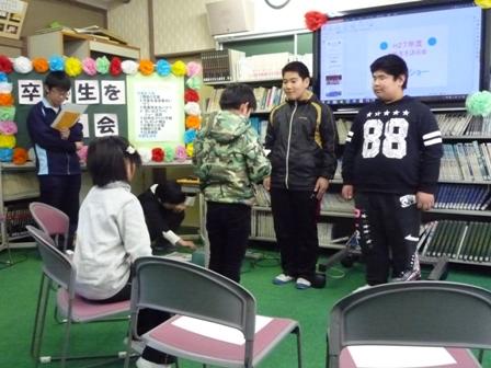 卒業生を送る会が、小中合同で行われました。児童・生徒会が企画し、司会は中学2年生が受け持ち、少ない在校生全員で、小学校を卒業する二人に心から感謝の気持ちを伝えようとがんばりました。特に、在校生一人一人が二人に対してそれぞれの素直な気持ちを伝えました。職員の中には、目頭を押さえていた方もいました。本当に良い送る会となりました。