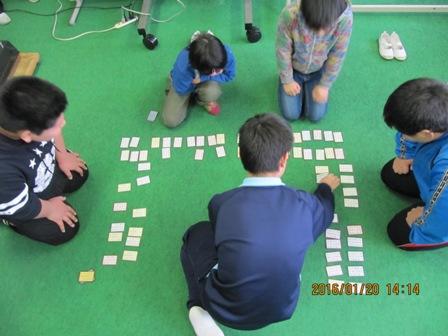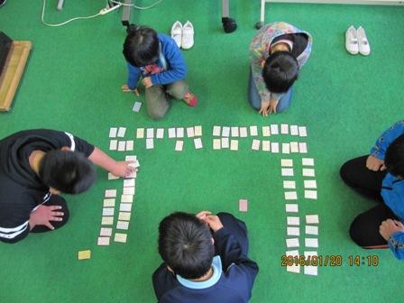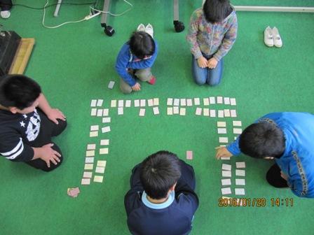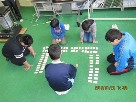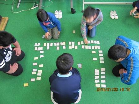 今年は小中学生合同の百人一首大会となりました。「百人一首」が難しいことは皆さんご存じかと思いますが、本校は今年度、小学生対中学生という対戦で行いました。中学生1名に対して、小学生4名が同時に対戦します。中学生は全て覚えているので、どこからでも取ることができます。対する小学生は、それぞれ目の前の20枚の札を覚えてその札に集中しています。古典文化に接するよい機会となりました。