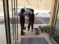 朝の登校時、栃木日光アイスバックスのマスコットキャラクター「しかっち」さんが出迎えてくれました。