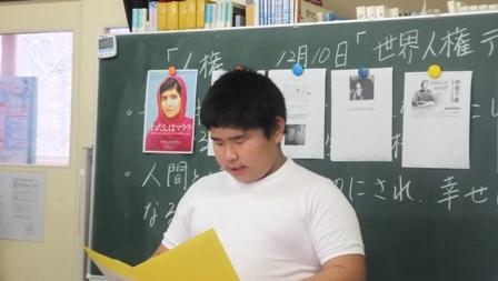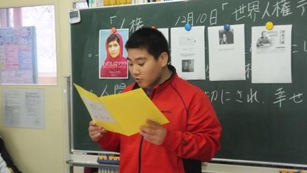 人権教育強化週間では、子供たちが学んだことを作文にして発表会を行いました。小中学生全員が他の児童生徒と先生たちの前で、堂々と大きな声で発表しました。一人一人の人権に関する発表内容はすばらしく、それぞれの学年に応じてしっかりとした考えを述べることができ、とてもよい発表会になりました。