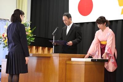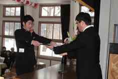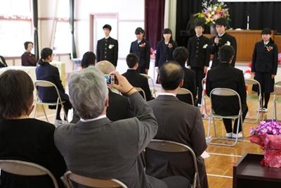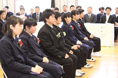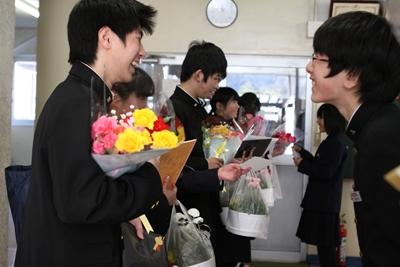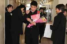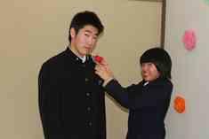 まずは後輩に胸花をつけてもらいます。 いよいよ式の始まりです。 卒業証書授与