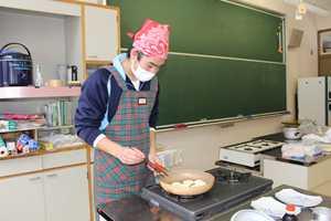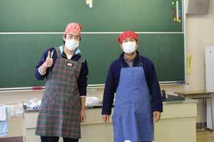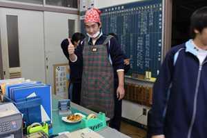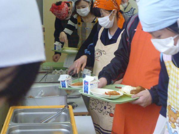 みんなエプロン、三角巾をして自分の選んだメニューを取っていきました。スープと牛乳は必須でした。
