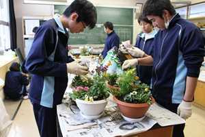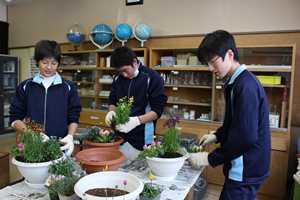 三依中学校では、株式会社コメリの「コメリ緑資金」から補助金をいただき、環境整備に活用させていただいています。今年度は、生徒数が減り活動時間の確保が難しい状況でしたが、「寄せ植え」と卒業式の会場の飾り付け等に活用させていただきました。