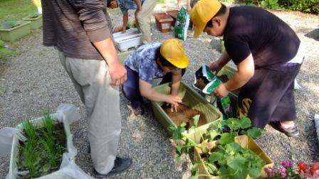 (プランターに土を入れているところ) (キュウリとミニトマトの苗を植えているところ)