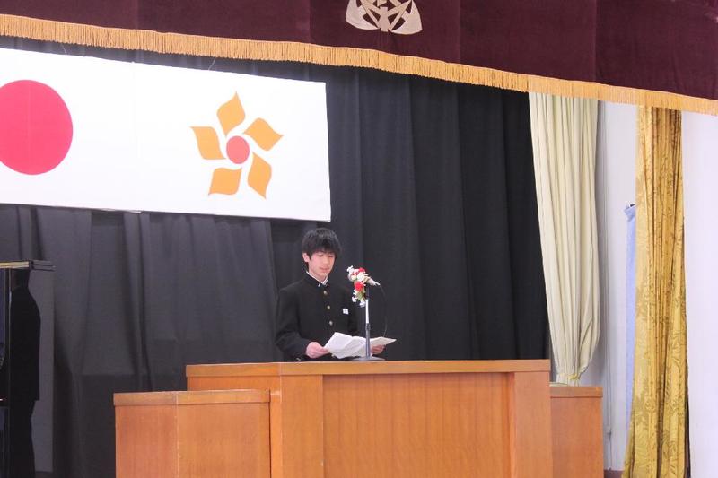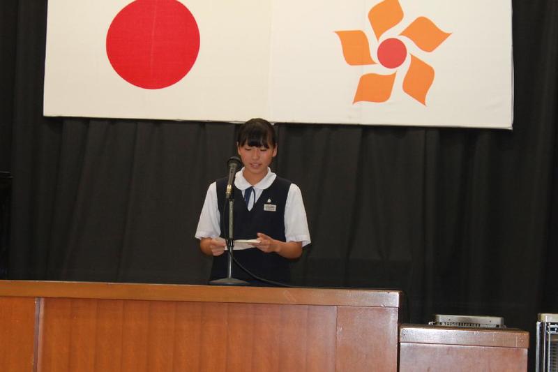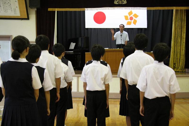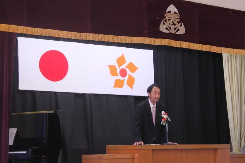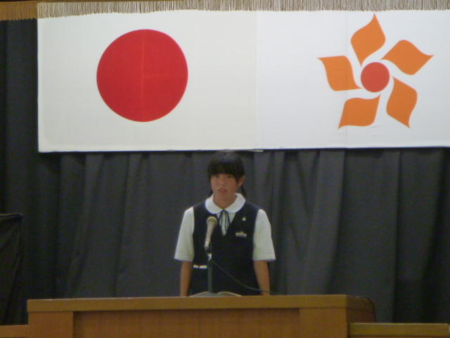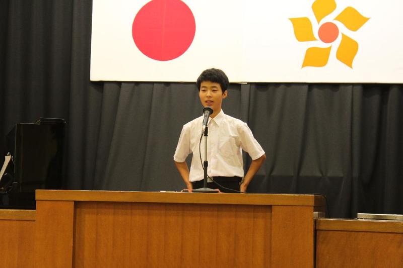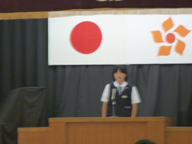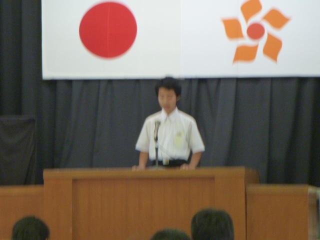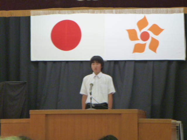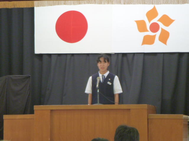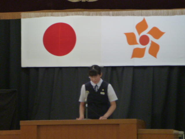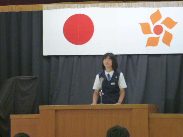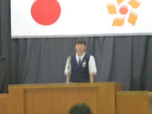 市の歌斉唱 「男体山は陽に映えて・・」 校長挨拶「スモールステップでいきましょう」 生徒意見発表「マスメディアはこわいものです」