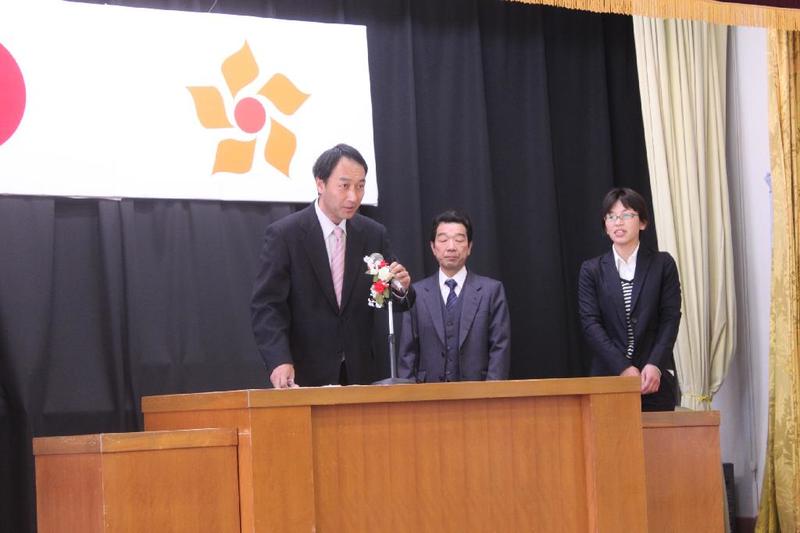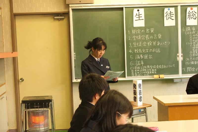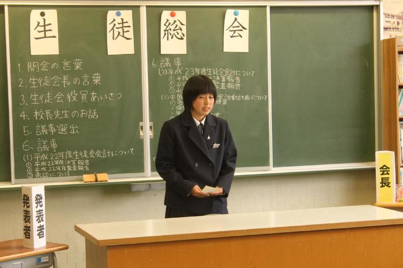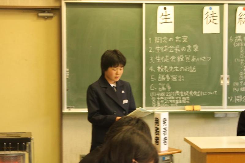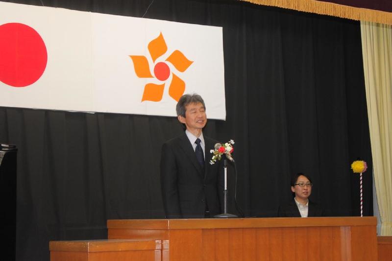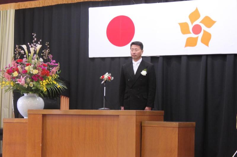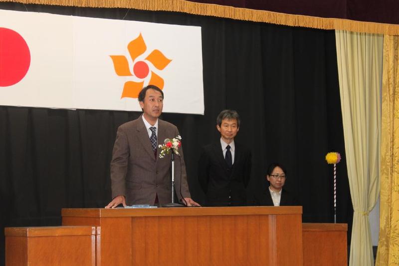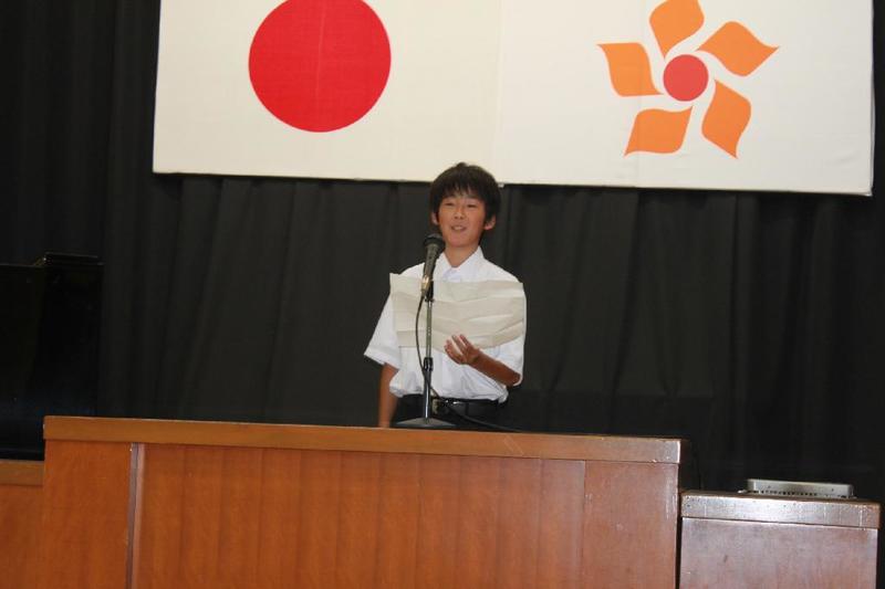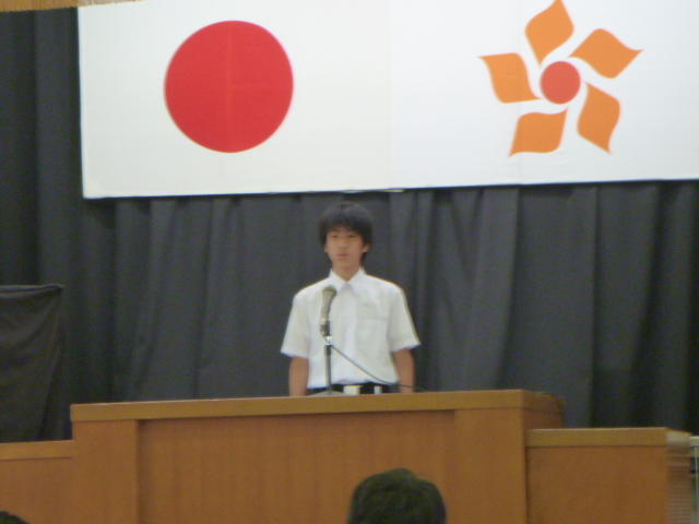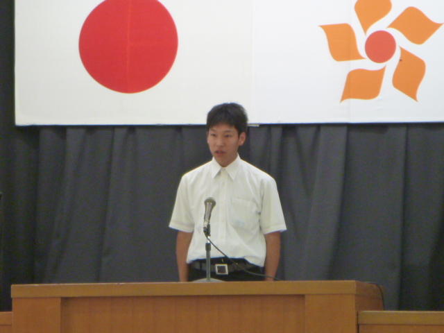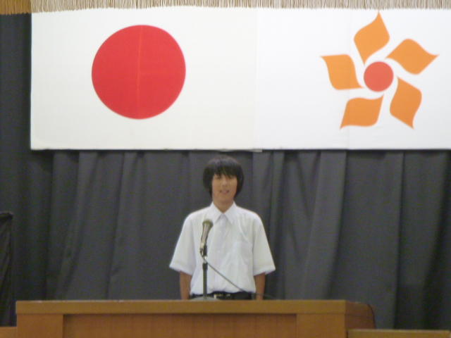 市の歌斉唱 「男体山は陽に映えて・・」 校長挨拶「スモールステップでいきましょう」 生徒意見発表「マスメディアはこわいものです」
