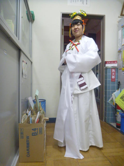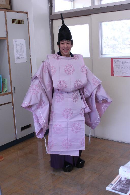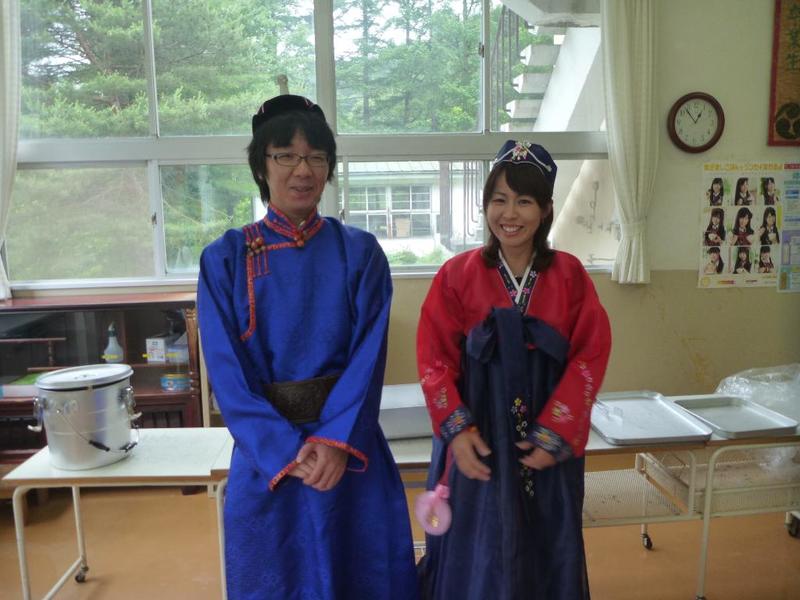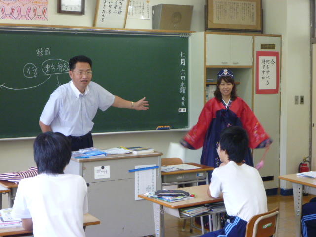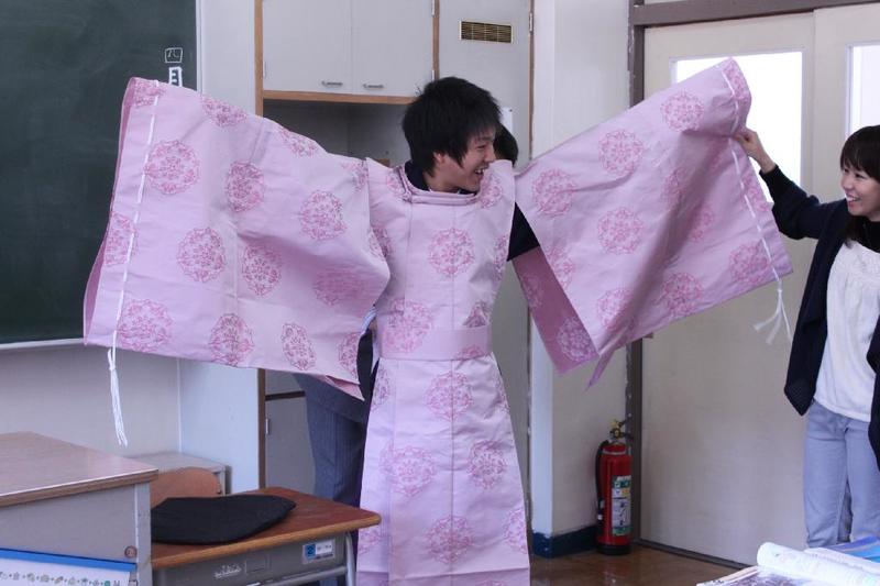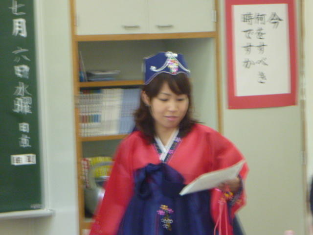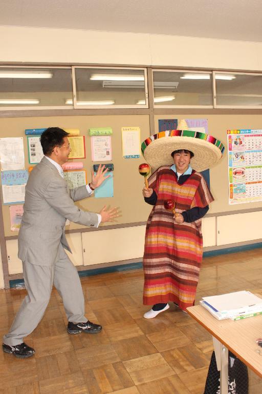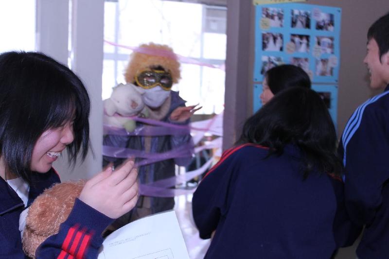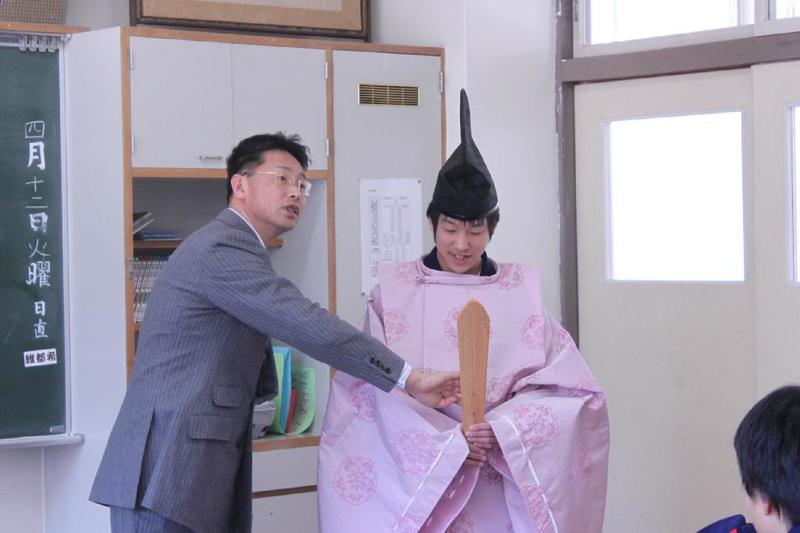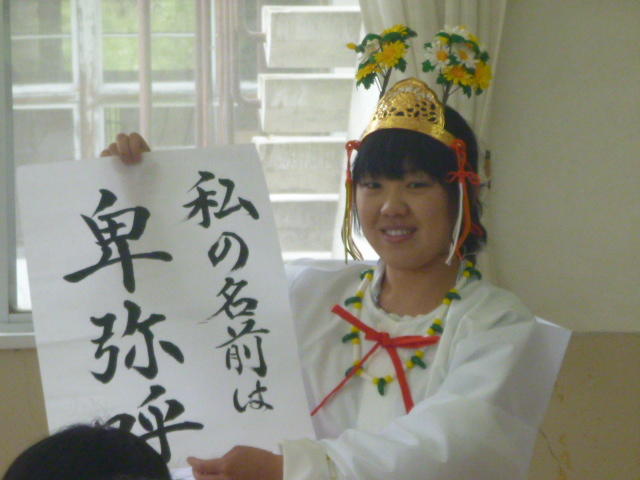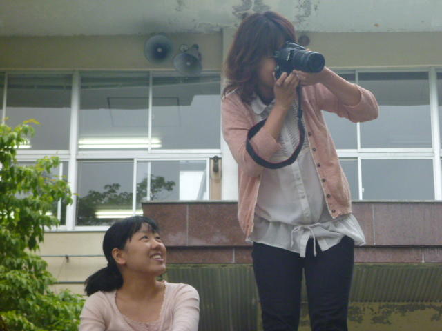 「きゃー、怖い。 教頭先生だ。」 優香先生が女学生に変装 O先生はそのままで大阪のおばちゃんに