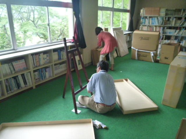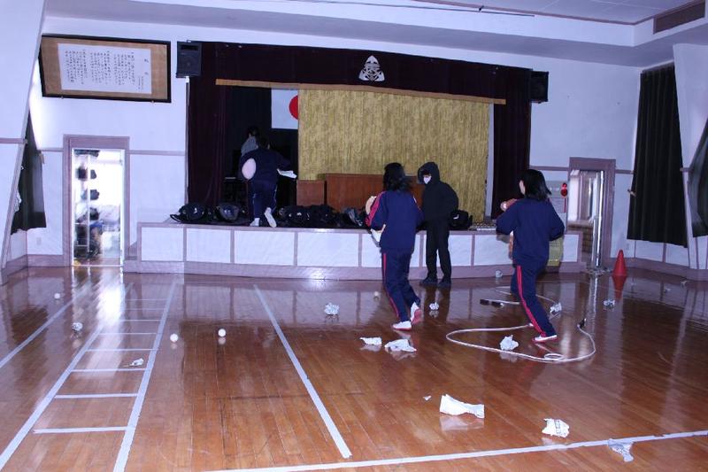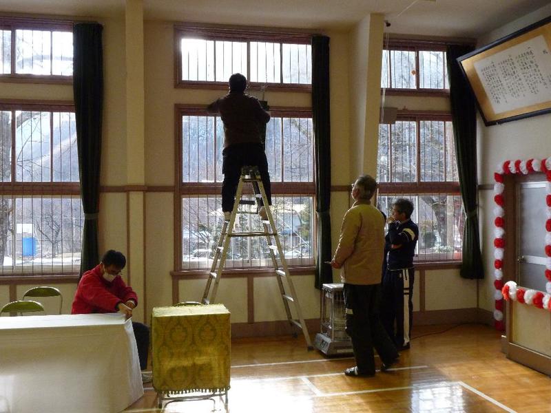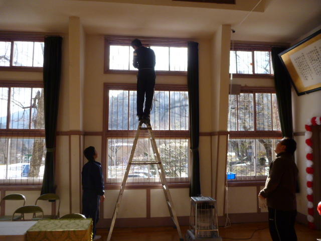 会場の講堂。脚立の人ちょっと危なそうなので・・ 選手交代。シルエットがだいぶ・・・ 飾り付けができてきました