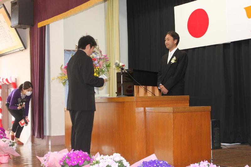校長に目録を贈呈する福島地区エリアマネージャーの和田浩志さん。右側は若くてハンサムなコメリ藤原店の尾形渉店長