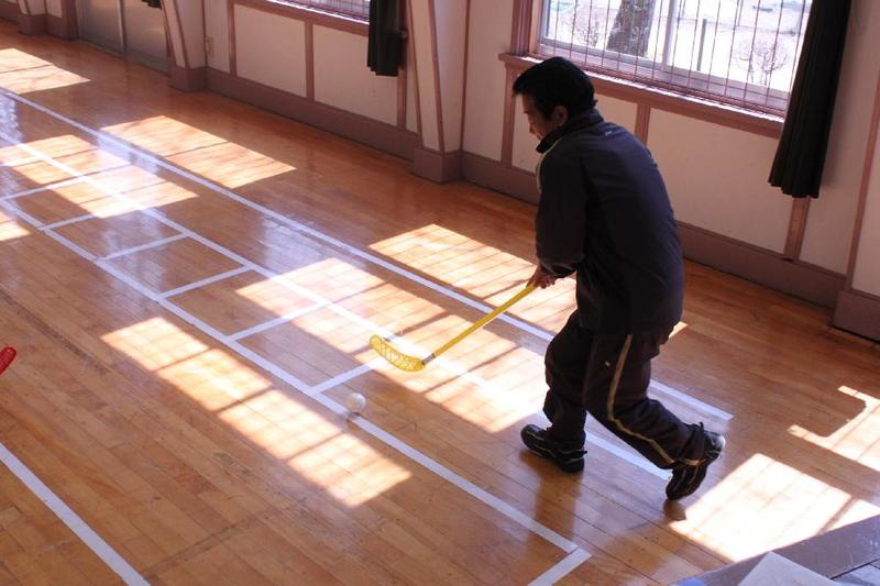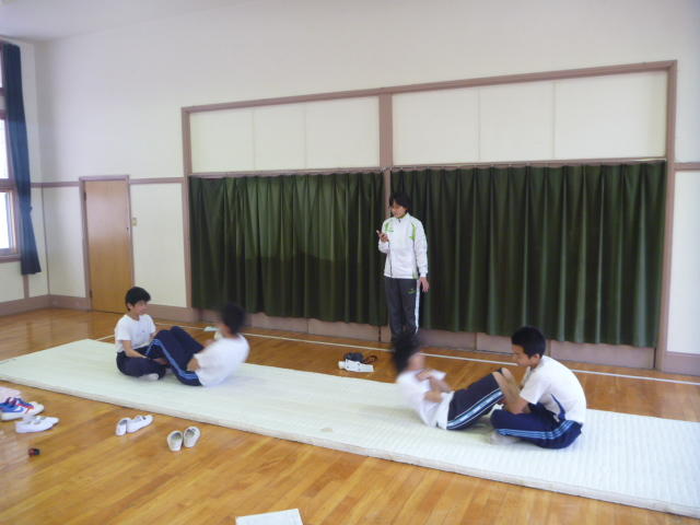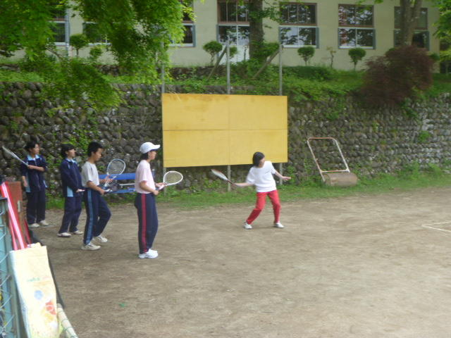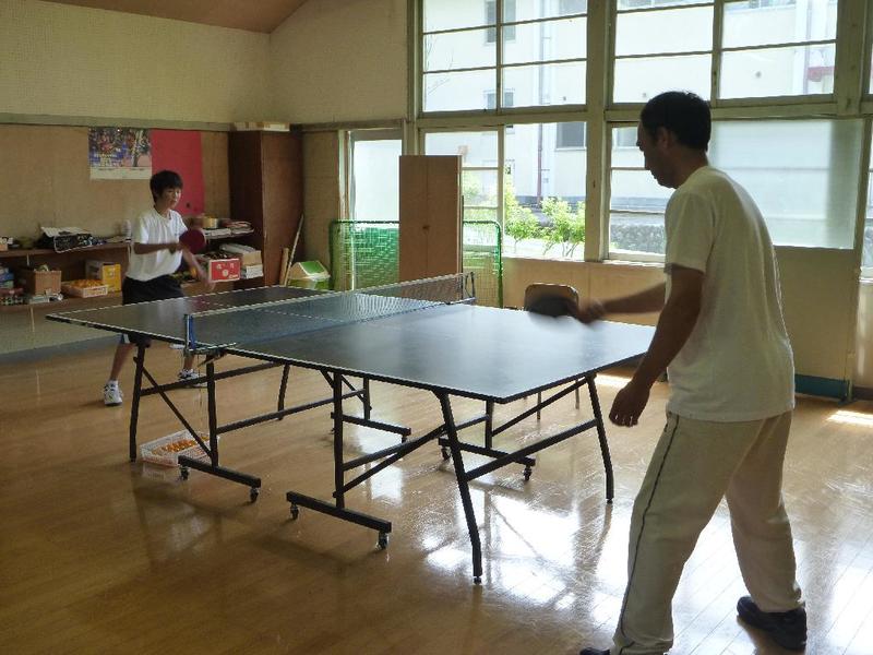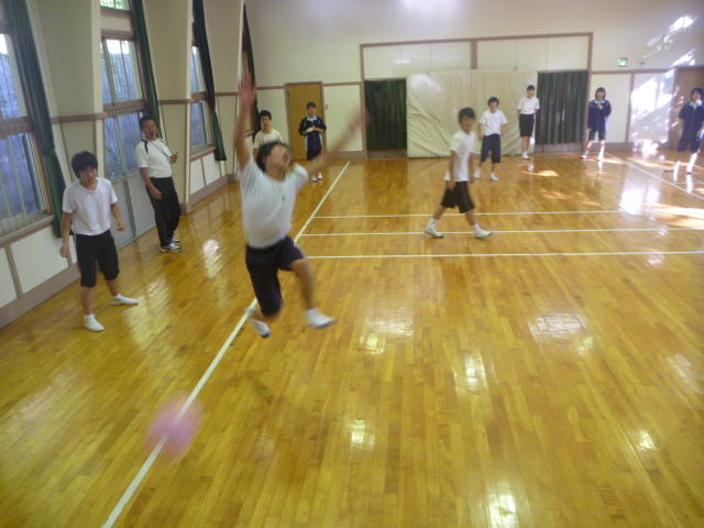 1,2年生がボールを打っています 卓球場では、校長先生も汗を流して 「みんな、明日は元気に登校してね」
