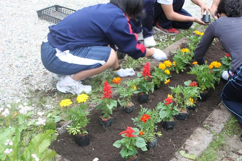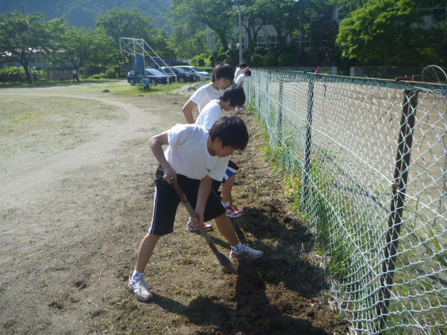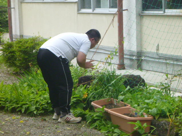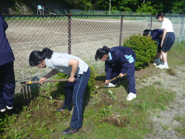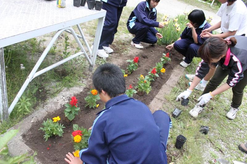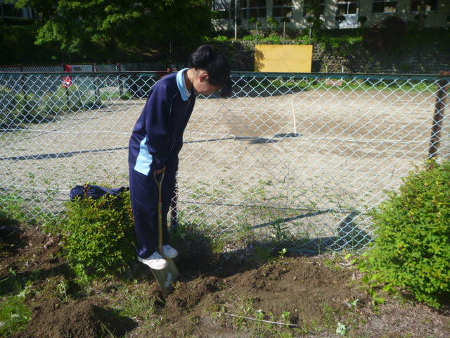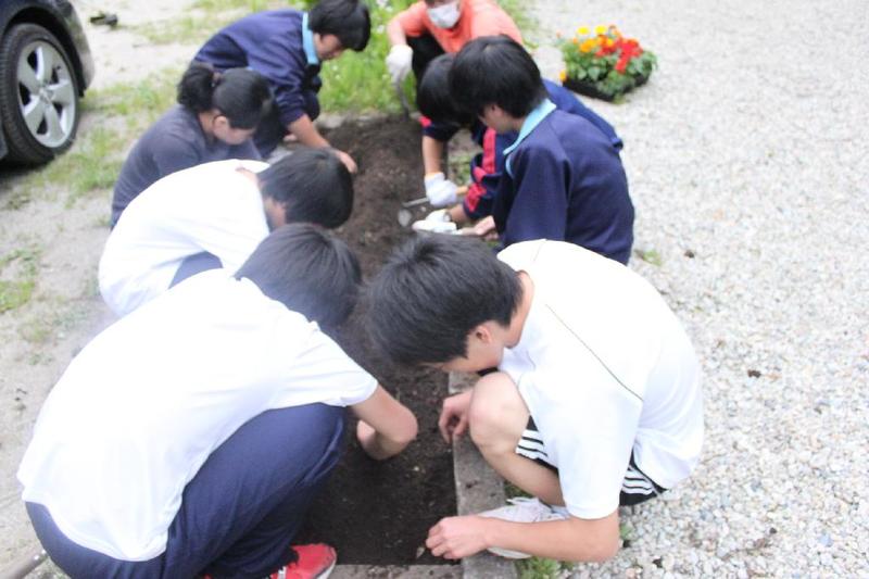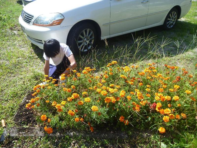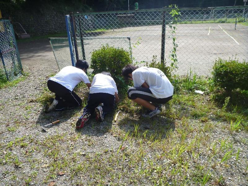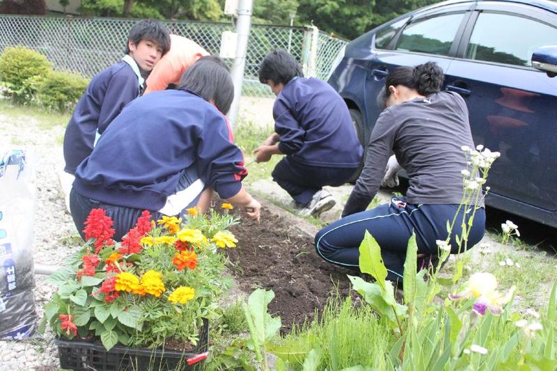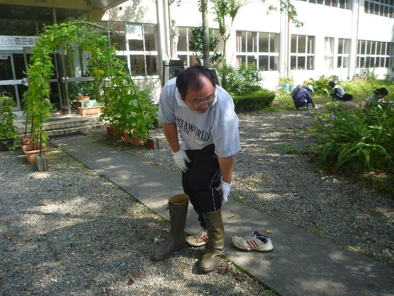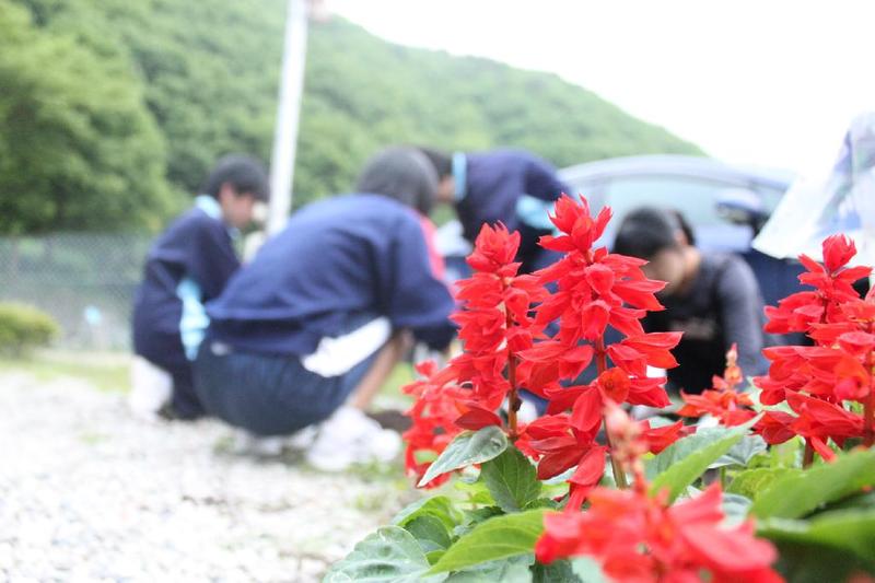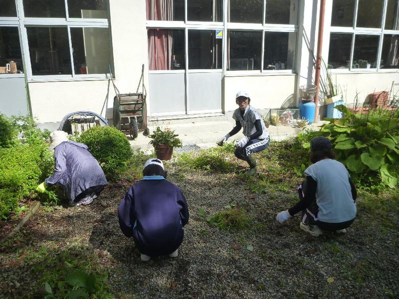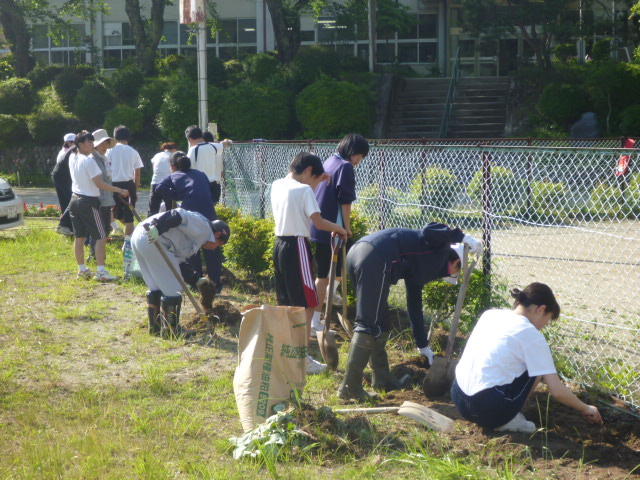 こつこつと、花壇をきれいにしています 男子生徒も一生懸命 保護者の方も