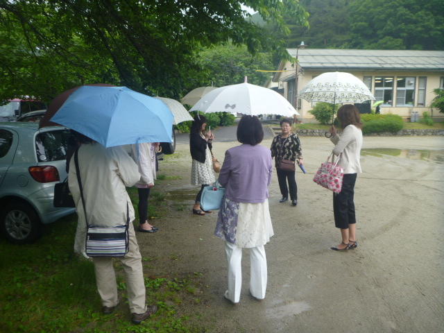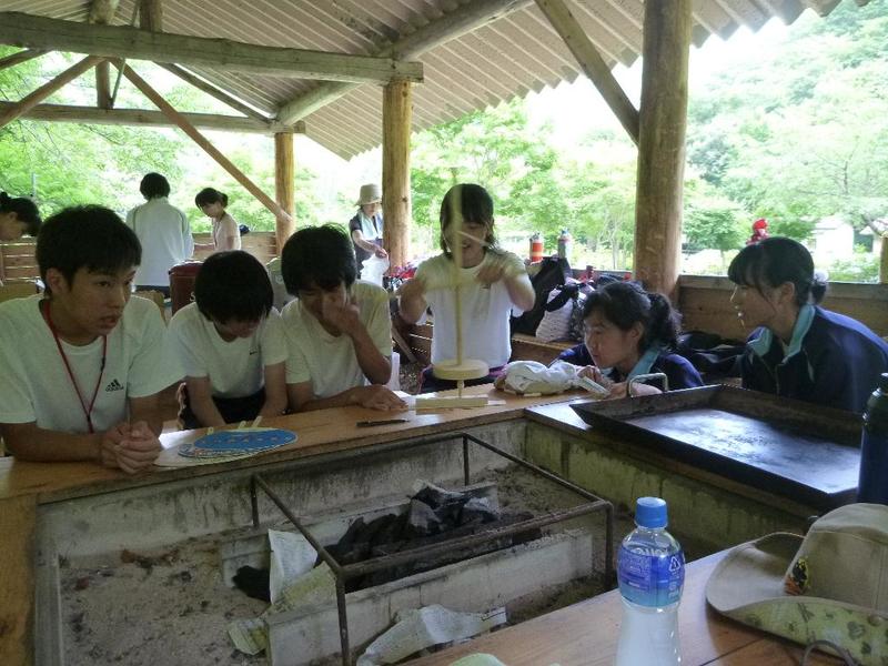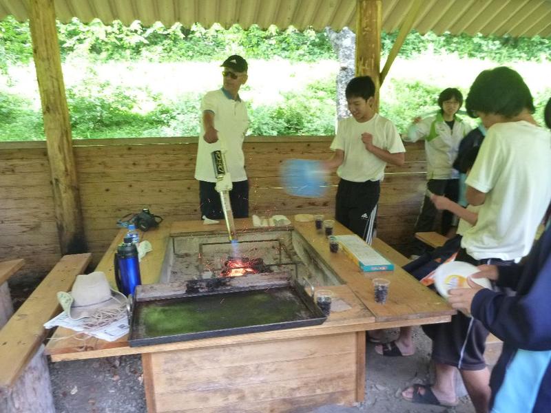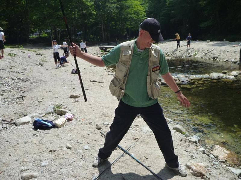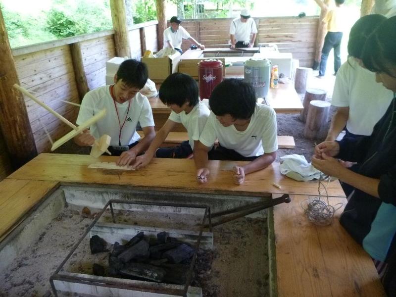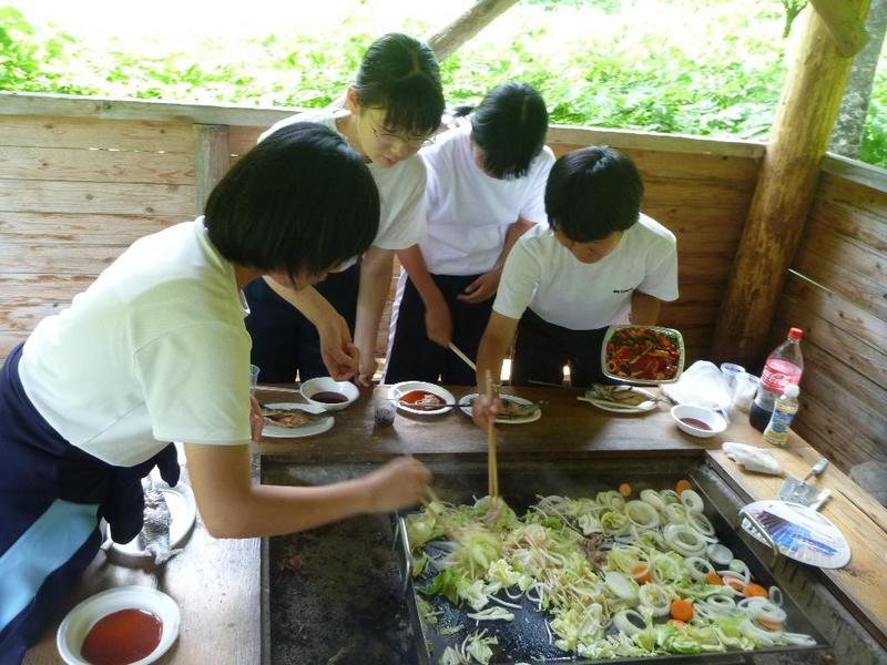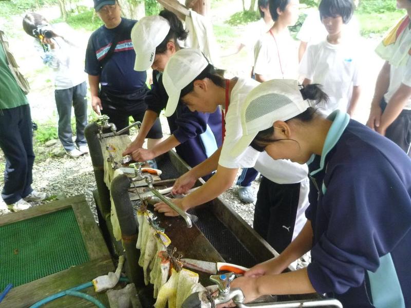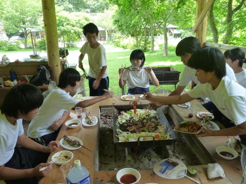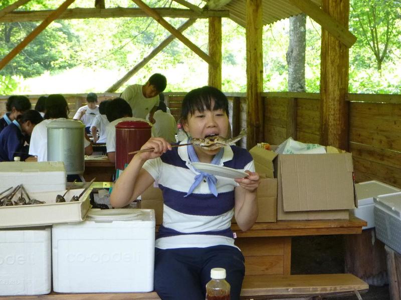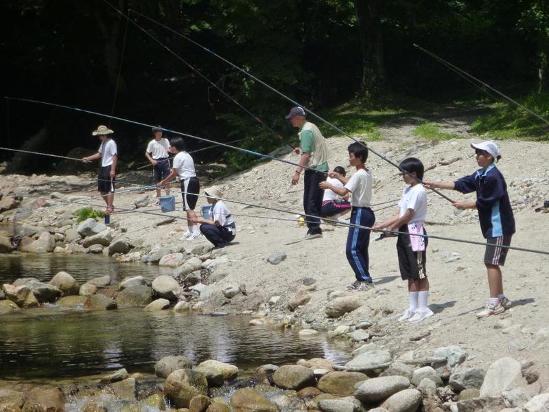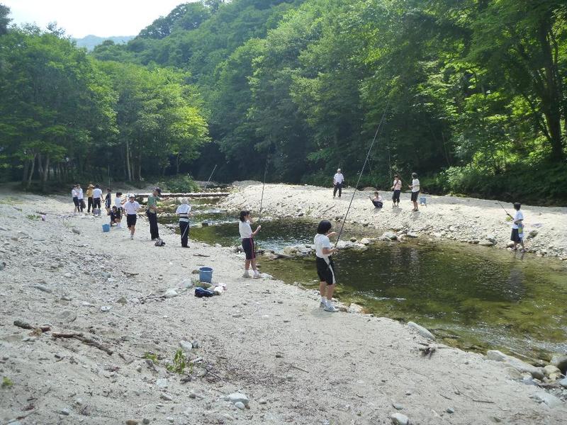 BBQ下ごしらえは学校で。みんなてきぱきと。「三依渓流つり場の皆さんよろしくお願いします。」 「つり開始です。」