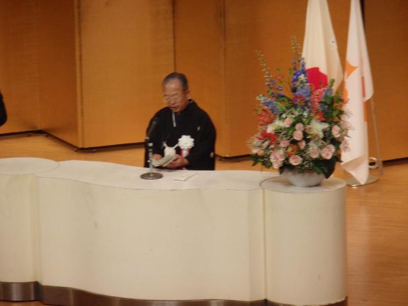 会場は、中央公民館中ホールです 前田教育長あいさつ「8月は特別な月です」 団長の諏訪校長先生あいさつ