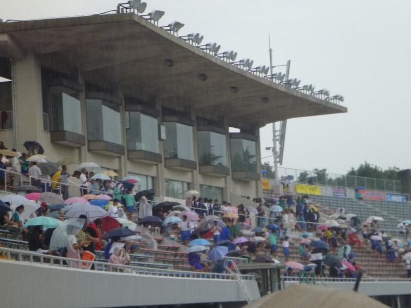会場は、県総合運動公園陸上競技場。朝からの雨にもかかわらず、スタンドには大勢の人が。 三依中応援団の方々
