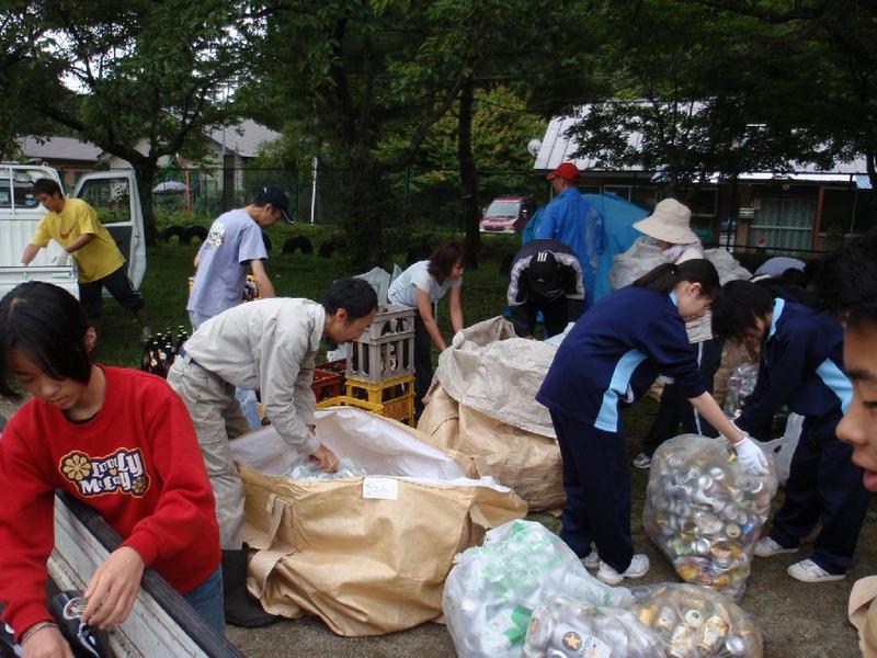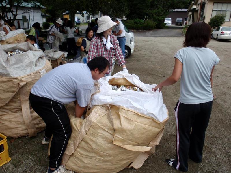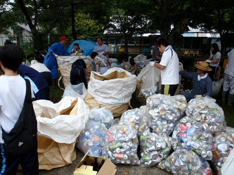 早朝より、たくさんのアルミ缶が集まりました。 袋にまとめて つぶし係はやはり、☆先生