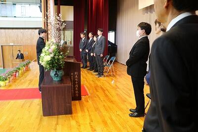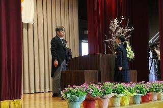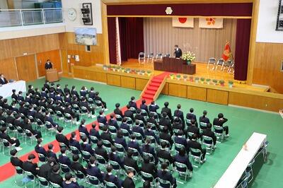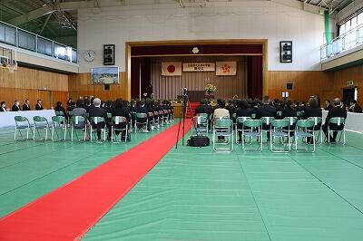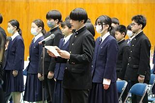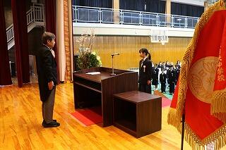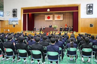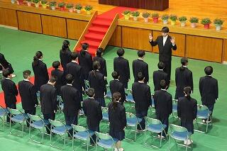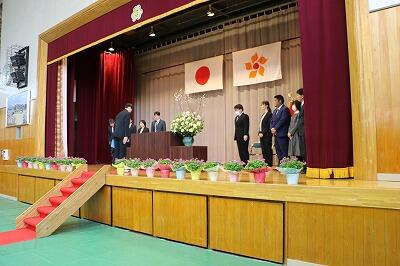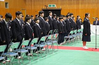 式では、教育長による「開校宣言」が行われた後、市長から新しい校旗が授与され、生徒会会長・副会長が校旗の披露を行いました。また、校旗原案・校歌制作者の紹介なども行われました。式の最後には新しい校歌が披露され、生徒たちは真剣に聴き入っていました。