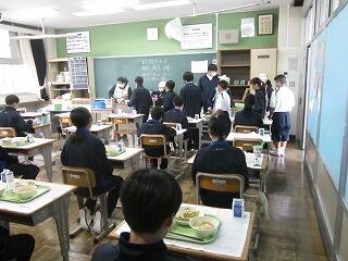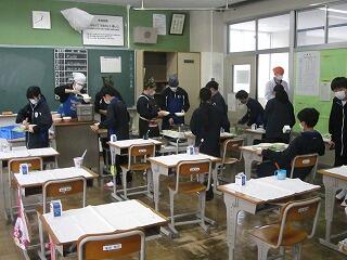 昨日入学した1年生には、中学校でのはじめての給食の時間です。小学校の時とやり方の違う部分があったと思いますが、みんな上手に配膳していました