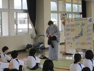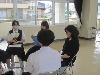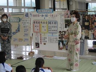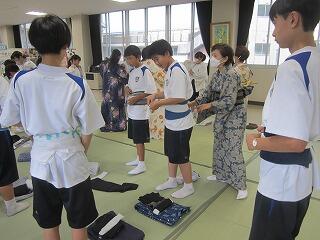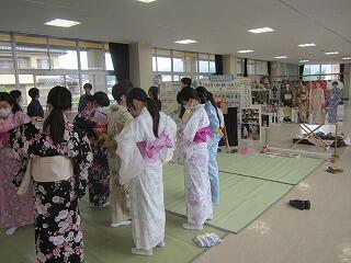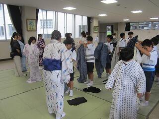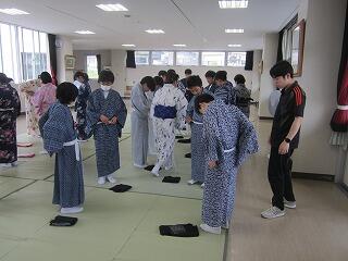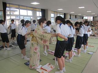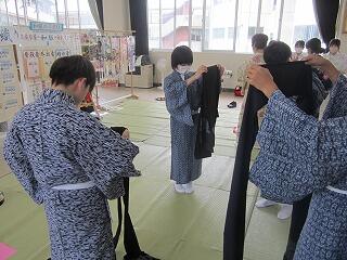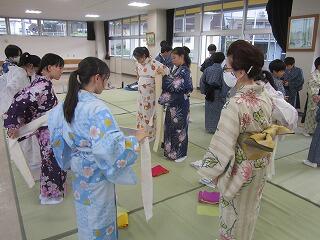 本日、ハクビ京都きもの学院から3名の先生方をお招きし、1年生が浴衣の着付けを学びました。