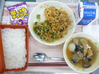 「キムタクごはん 牛乳 ごまあえ けんちん汁 紫いもチップス」です。