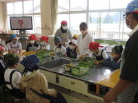 調理員さんに、根菜を洗う機械を見せてもらったり、泥やゴミ、虫が給食に入らないよう、