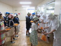 給食時間、真っ先にとうもろこしに手を伸ばす4年生。