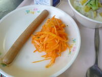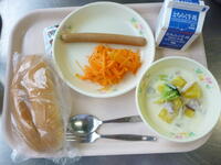 この日の給食は「セルフドック、牛乳、にんじんのラペ、さつまいものシチュー」です。
