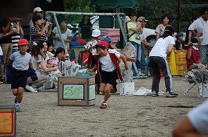 続いて,1年生と6年1組の対決。6年生のかごは入り口が狭くなっています。