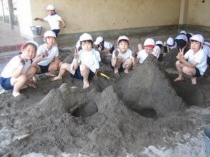 最後に、みんなで「エーーイ」 「トリャー」と 山を壊して終わりにしました。