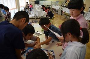パソコンの画面を見たり,お家から持ってきたガイドブックを見たりしていろいろ考え,相談しています。