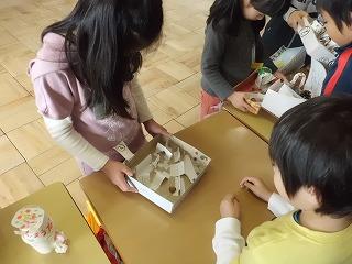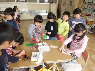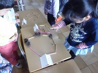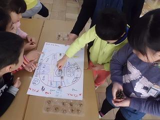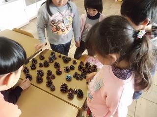 1年生は,秋に集めたどんぐりやまつぼっくりなどを使った遊びを考え,
