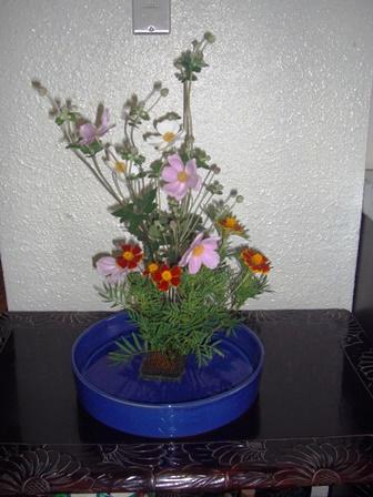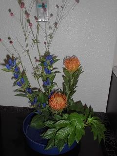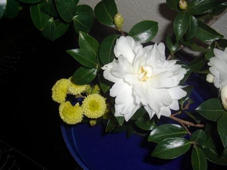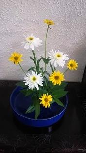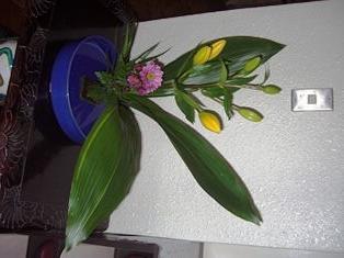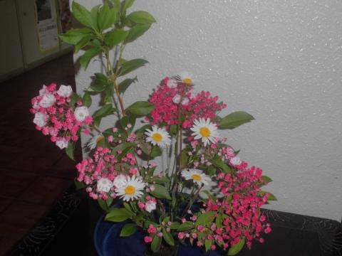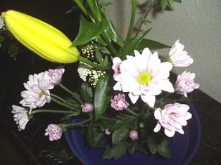 小手鞠とユリ、そして菊でしょうか。淡い色合いの花の組み合わせは、私にはとっても清々しく感じられ、好きです。