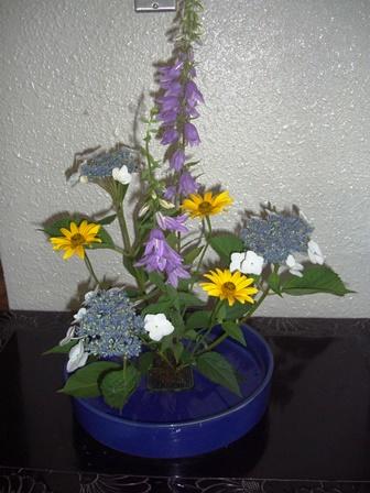 小ひまわりの黄色、ガクアジサイの白色と青色、ソバナの紫色が