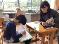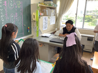 栃木県聴覚障害者協会から2名の先生にお越しいただき、耳が聞こえない人の生活についてお話を聞きました。相手に自分の思いを伝える方法は、手話だけでなく、筆談やジェスチャー、口の動きなどいろいろな方法があることがわかりました。