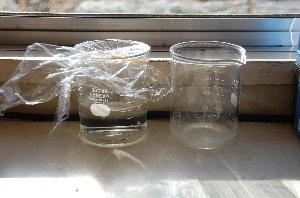 これは、1組のビーカーです。ラップをしていないビーカーの水は、すっかりなくなってしまいました。