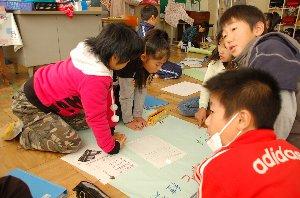 みんながよく見えるように,模造紙にシールを貼って点字にしています。