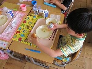 「背中をピンと伸ばして食べるために、器を持って食べましょう!」という