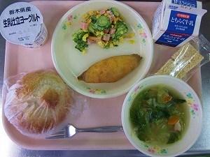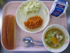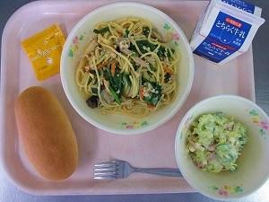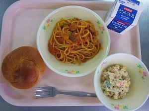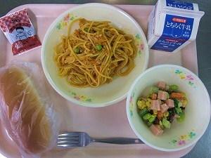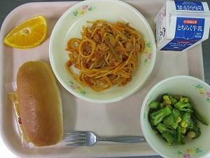 「ミルクパン アップルハニー 牛乳 スパゲティナポリタン 大豆入りサラダ オレンジ」です。